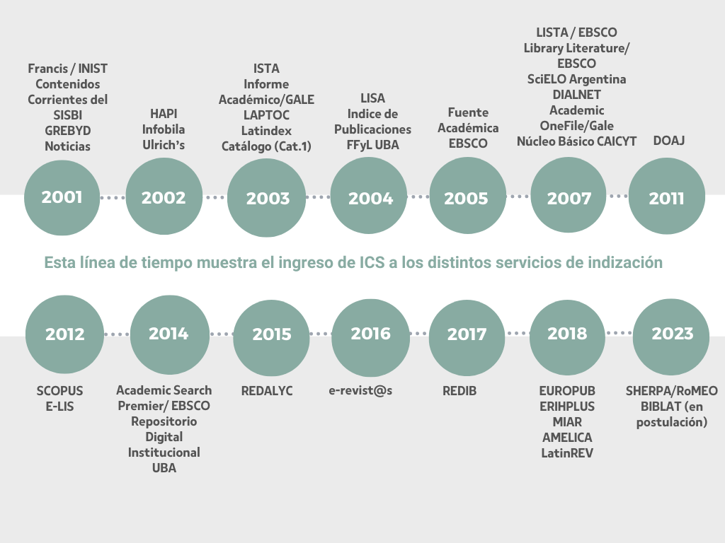 Este gráfico muestra el recorrido de Información, cultura y sociedad a través de su incorporación a las bases de datos referenciales o de texto completo, a los directorios y a las plataformas.