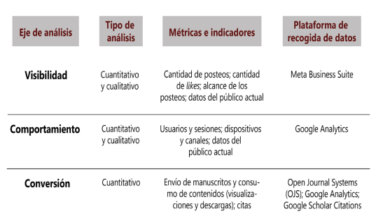 A partir de lo expuesto, partimos de la propuesta de Vitela Caraveo y Urbano (2020) para el análisis de datos de revistas científicas mediante herramientas de analítica web. Así, la metodología planteada para este trabajo consiste en el análisis de la información aportada por los siguientes ejes: a) la visibilidad de la revista en las redes sociales, b) el comportamiento de los usuarios en la página web y c) el impacto de los contenidos publicados, en términos de la conversión de acciones de los usuarios y/o lectores (Figura 1). Con el fin de complementar el análisis cuantitativo de las métricas obtenidas, también se recolectaron datos cualitativos estimativos6 que incluyeron información sobre el género, la edad y la procedencia geográfica de los usuarios. En MBS este tipo de información es declarada directamente por los usuarios de las redes sociales7 al momento de crear una cuenta o perfil (Meta, 2024). Por su parte, en OJS y Google Analytics la procedencia geográfica de los visitantes es arrojada por la dirección IP8, mientras que el género y la edad se obtienen de la información proporcionada por los usuarios durante su registro en el navegador utilizado (Google, 2024).