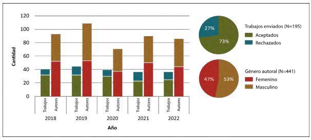 A partir de la plataforma OJS se obtuvieron métricas sobre la cantidad de manuscritos enviados a la revista en donde, además, fue posible distinguir aquellos que habían sido aceptados y rechazados, dando cuenta de una tasa media de rechazo del 27% para todo el período bajo análisis (Figura 5). También se observó que, sobre un promedio de 39 contribuciones al año, existe un gradual decrecimiento en la cantidad de trabajos recibidos entre 2019 y 2021, que parece estabilizarse a partir de 2022. Por su parte, los 195 manuscritos enviados durante el rango temporal considerado han sido firmados por un total de 441 autores, dando cuenta de una alta frecuencia de coautoría, cuya composición demográfica muestra proporciones relativamente similares entre autoría femenina y masculina. Además, en cuanto a su procedencia geográfica, y atendiendo a la afiliación institucional declarada, es posible observar una amplia frecuencia de autores nacionales (83%). En menor proporción, la autoría extranjera se distribuye principalmente entre colegas de Uruguay (4%) y España (4%), seguidos de Brasil (2%), Ecuador (2%) y México (2%).