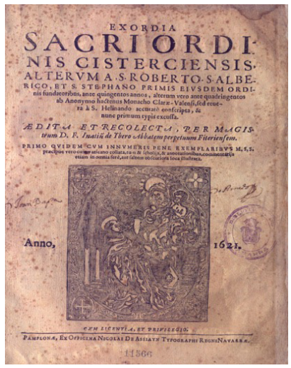 Ya hemos visto que Ibero estuvo detrás de la compra de la prensa y sus utillajes a mediados de 1606. Esto dotó al monasterio de Fitero de todo lo necesario para publicar textos impresos, caso del Exordia sacri Ordinis Cisterciensis23 de 1606, una edición que se puede considerar, según García Larragueta (1974: 178), “como el primer ejemplar navarro salido de una prensa propia de monasterio”. Dicha obra, ya citada por Pérez Goyena (1949, II: 26)24, fue la antesala de otras obras que se imprimieron después en otros monasterios navarros como Irache o La Oliva.