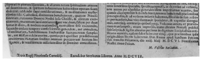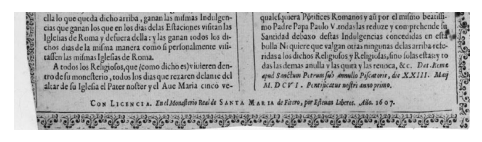 Gracias a ambos documentos podemos reconstruir su efímero paso por este monasterio cisterciense. Concretamente se trata de dos sumarios de indulgencias (Figuras 6 y 8) concedidas por el papa Paulo V31 en Roma, en cuya parte inferior leemos el nombre del impresor en castellano (“Esteban Liberos”) y en latín (“Stephanus Liberos”), junto al lugar de publicación: “En el Monasterio Real de Santa María de Fitero” y “Typis Regii Fiteriensis Cœnobii” (Figuras 7 y 9). Nos encontramos, por tanto, ante dos nuevos testimonios bibliográficos que recientemente se han recogido en la tipobibliografía que se ha confeccionado sobre la imprenta en Navarra entre 1601 y 170032.