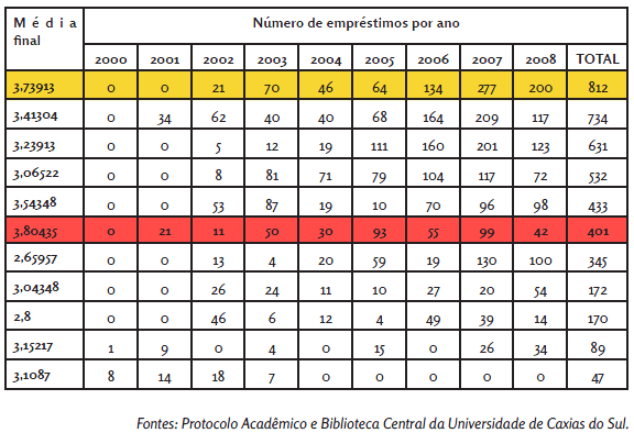 Ao comparar os dados dos empréstimos de livros das turmas pesquisadas com as médias finais, evidenciou-se que aqueles alunos que menos utilizaram os serviços de empréstimos são os que apresentaram os desempenhos mais baixos. Além disso, constatou-se uma tendência de que os alunos com as melhores médias são os que mais usufruíram dos serviços de empréstimo da Biblioteca Central da Universidade de Caxias do Sul. Sobre isso convém recordar que, no período pesquisado, o empréstimo de livros era o principal serviço da biblioteca, a qual não disponibilizava o uso de livros digitais.