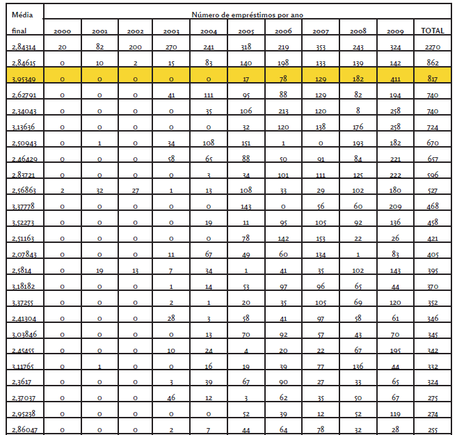 Conforme mencionado anteriormente, a atribuição de valor a uma biblioteca é uma tarefa subjetiva, pois se baseia nas percepções particulares e individuais dos usuários. Entretanto, somente esses aspectos subjetivos não são suficientes para dimensionar a contribuição da biblioteca para o sucesso acadêmico. Por isto, foram analisados dados sobre o histórico de utilização do serviço de empréstimos da Biblioteca Central dos nove alunos entrevistados e dos seus colegas de turma. Essa análise foi feita a partir de tabelas que contêm a média final4 acadêmica de todos os alunos graduados na turma e o registro das operações de empréstimo ocorridos durante todo o período da graduação.