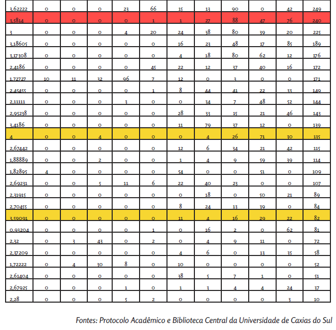 A turma do entrevistado S3 (tabela 3) formou-se em Relações Públicas no ano de 2011 e era composta por 48 alunos. Ao verificar-se o número de empréstimos em comparação com a média final dos alunos, é possível perceber fortes indícios dessa relação, pois entre os 23 alunos que mais retiraram obras, constata-se que 20 desses obtiveram uma média final superior ao conceito 3. O aluno que obteve a láurea acadêmica foi, inclusive, o acadêmico que mais utilizou o serviço de empréstimos. Em contrapartida, ao analisar os 11 alunos que menos utilizaram o serviço de empréstimos, oito desses obtiveram uma média final inferior ao conceito 3.