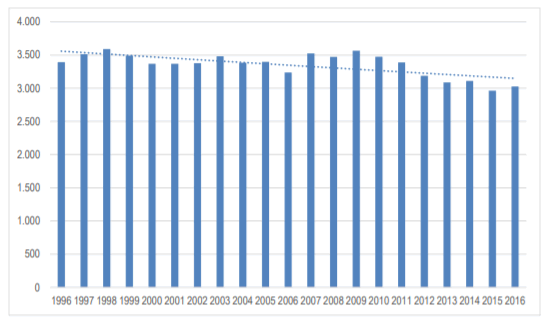 En la figura 2 se ofrece la evolución anual de la tirada media de ejemplares por título publicados en España de 1997 a 2016 (en miles de ejemplares) que, como se puede observar, ha ido disminuyendo progresivamente: en 2016 la tirada media ha sido de 2.740 ejemplares, mientras que, en 1997, la tirada media se situaba en los 6.670 ejemplares, lo que ha supuesto una reducción de la tirada media en un 59% para el período considerado. Sin embargo, se da la circunstancia de que, en el mercado editorial español, coexisten obras con fuertes tiradas y libros que no alcanzan los 1.000 ejemplares.