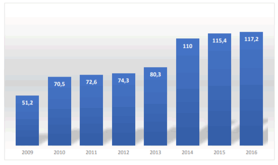 En cualquier caso, el peso de la facturación por libros digitales sobre el total facturado en cada materia continúa siendo bastante reducido en comparación con el resto de soportes con la única excepción de los libros de Derecho y Ciencias Económicas -incluidos en la categoría Ciencias Sociales y Humanas. En la Figura 6 se muestra la cifra de negocio de la industria de los libros editados en formato electrónico en España desde 2009 hasta 2016, expresada en millones de euros lo que significó un incremento de aproximadamente dos millones con respecto a la cifra registrada el año anterior. La venta de libros en formato electrónico ha facturado 117 millones de euros en 2016, un 1,5% más que en 2015. Aunque la facturación generada a través de las ventas de libro electrónico sigue en ascenso, esta no supone más del 5% de la facturación total de las empresas editoriales.