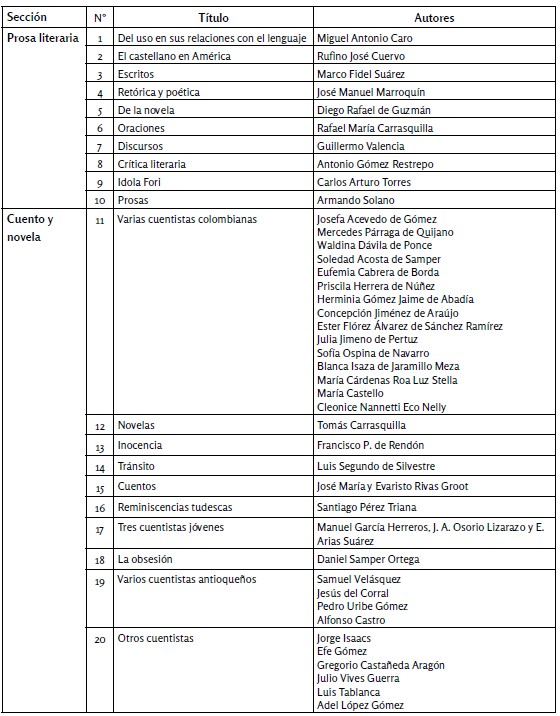 Secciones literarias, títulos y autores de la Selección Samper Ortega de Literatura Colombiana