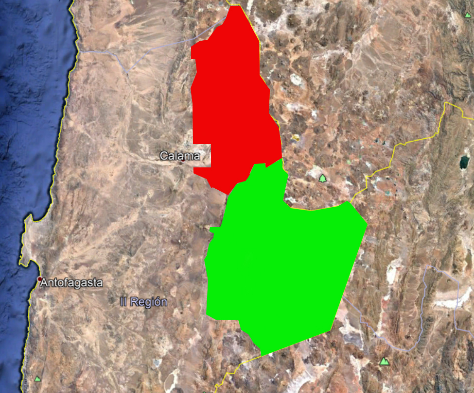 Figura 1. Parte de la región de Antofagasta y situación aproximada de las dos Áreas de Desarrollo Indígena. En rojo Alto El Loa, en verde Atacama La Grande.