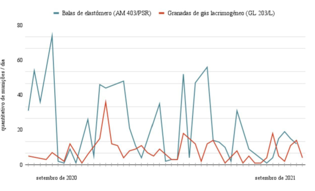 Figura 3. Quantitativo de munições menos-letais despendidas por dia pela Guarda Civil Metropolitana na chamada Cracolândia entre os meses de setembro de 2020 e setembro de 2021. Fonte: SMSU (2021).
