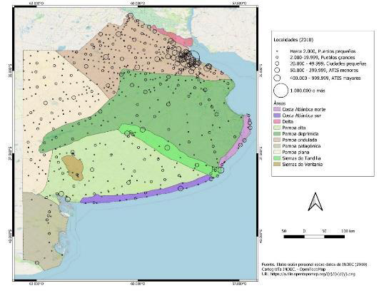 Figura 2. Trama de localidades en 2010 y áreas. Provincia de Buenos Aires. Fuente: elaboración personal sobre datos de INDEC (2010) y Reboratti (2012).