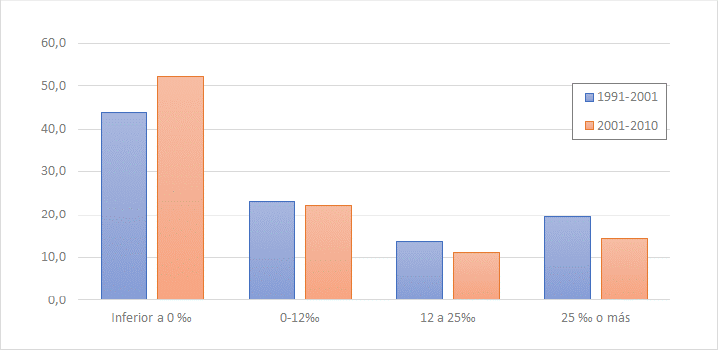 Figura 3. Distribución relativa de pueblos pequeños según tasa anual de crecimiento intercensal, 1991-2010: Fuente: Elaboración personal sobre datos de INDEC, 1991, 2001, 2010.
