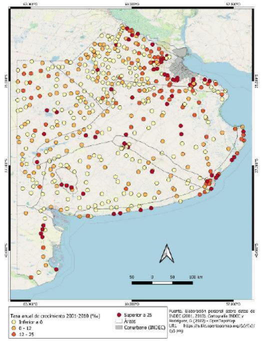 Lindenboim y Kennedy (2004) manifiestan que, en la Región Pampeana, entre 1960 y 1980, las localidades de 2000 a 10.000 habitantes aumentaron su tasa de crecimiento. De 1991 a 2001, en los subgrupos (2000-5000 y 5000-10.000) se retrae el ritmo de crecimiento, sobre todo en el conjunto mayor. De allí, la importancia de reflexionar sobre los vínculos entre lo urbano y lo rural. Sobre Buenos Aires, Bertoncello (2012) muestra que se pasa de un 50 % de población urbana (1914) a un 90 % (2001) y afirma que en “la población rural bonaerense no solo crece menos que la urbana, sino que decrece” (2012: 350).