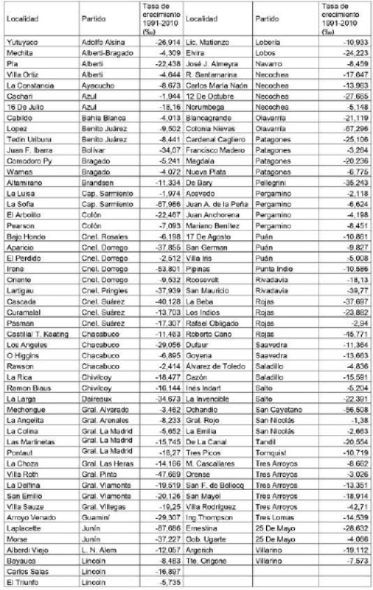 Las cien localidades en decrecimiento persistente se ubican en la Pampa ondulada (36 %), alta (21 %), deprimida y plana (19 % en cada una). En la Pampa ondulada las localidades en decrecimiento se ubican preferentemente hacia el oeste, alejadas del Área Metropolitana de Buenos Aires, a diferencia de las más dinámicas. En la Pampa deprimida, los poblados en peor situación demográfica están en sus bordes, especialmente hacia el centro-oeste. Alejados también de los circuitos económicos más dinámicos asociados a la pesca deportiva y turismo o los nuevos emprendimientos de urbanizaciones privadas.