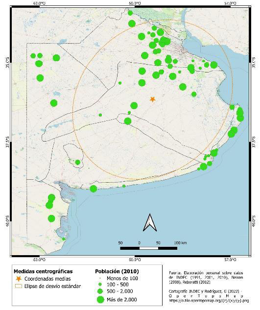 Luego, para los conjuntos de pueblos, tanto los que decrecieron a lo largo de todo el período (tasa inferior a 0 ‰) como los que siempre crecieron a ritmos acelerados o muy acelerados (tasas superiores al 12 ‰) se hizo análisis centrográfico (Buzai y Montes-Galbán, 2021) en un sistema de información geográfica. Por último, se analizaron los grupos de localidades con las siguientes capas de información: