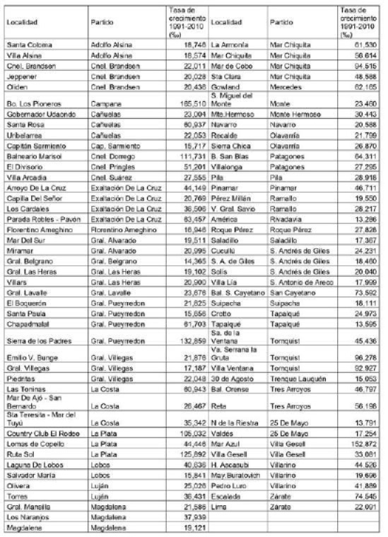 La distribución territorial de los 86 pueblos con tasas de cambio acelerado muestra el protagonismo de la Pampa ondulada (39 %), deprimida (21 %) —preferentemente hacia el norte o en sus límites con Sierras de Tandilia y Costa Atlántica norte—, y Sierras de Tandilia y Costa Atlántica sur-norte (8 %). Tomando en cuenta la Costa Atlántica como un todo, 21 localidades (15 %) tuvieron crecimiento veloz. En 1991, las 86 localidades tenían 296.680 habitantes y la tasa anual de crecimiento fue del 45 ‰ (1991- 2001). En 2010 tenían 404.272 habitantes, con una tasa alta pero en leve retroceso (34,1 ‰). Sobresale la primacía de aglomeraciones de mayor tamaño, en las cuales las tasas de crecimiento positivas son inferiores a las de los pueblos de menor dimensión (Cuadro 6). Los poblados con menos de 100 habitantes y tasa de crecimiento superior al 12 ‰ se concentraron en la Pampa ondulada y Costa Atlántica norte y sur. Este escenario se repite en el intervalo siguiente (100-500 habitantes), sumándose algunos sectores de la Pampa deprimida, Sierras de Tandilia y de Ventania. Las localidades más pujantes de la Pampa ondulada se congregan en torno al área Metropolitana de Buenos Aires y en el resto de la provincia algunas se conectan con la expansión de actividades turístico-recreativas. En general, los pueblos grandes están en el norte de la Pampa ondulada, noreste de la Pampa plana, norte de la Pampa deprimida, costas norte y sur y sobre el corredor patagónico de la Ruta 3.