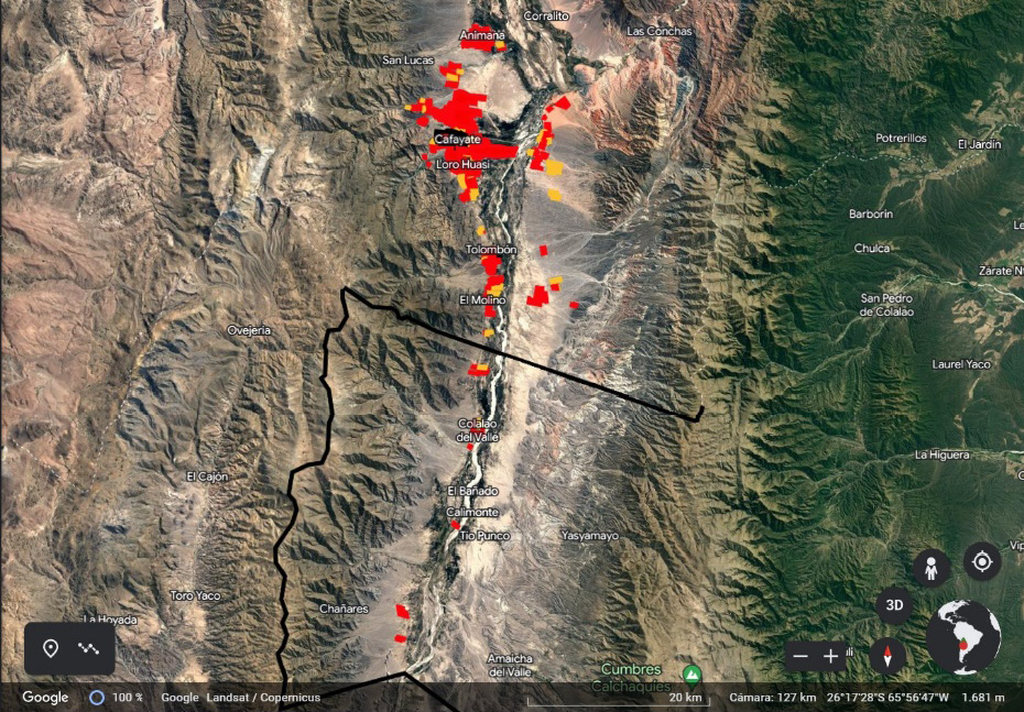 Figura 2. Superficies afectadas por el cultivo de vid y emprendimientos turísticos de gran escala (en rojo) y superficies desmontadas para cultivar vid (amarillo) en el sector tucumano. Elaborado por la autora a partir de Google Earth.