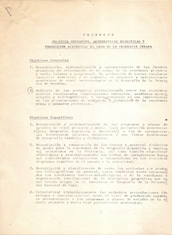 El proyecto no intenta realizar una historia didáctica de la Geografía, sino incursionar en su historia disciplinaria, para ver la inserción del “discurso geográfico” y su “papel ideológico” en los distintos niveles de la enseñanza formal; a partir del análisis de los contenidos de programas y planes de estudio, textos y producción académica a nivel terciario y universitario. (Unidad de Investigación Mendoza, 1989:2)