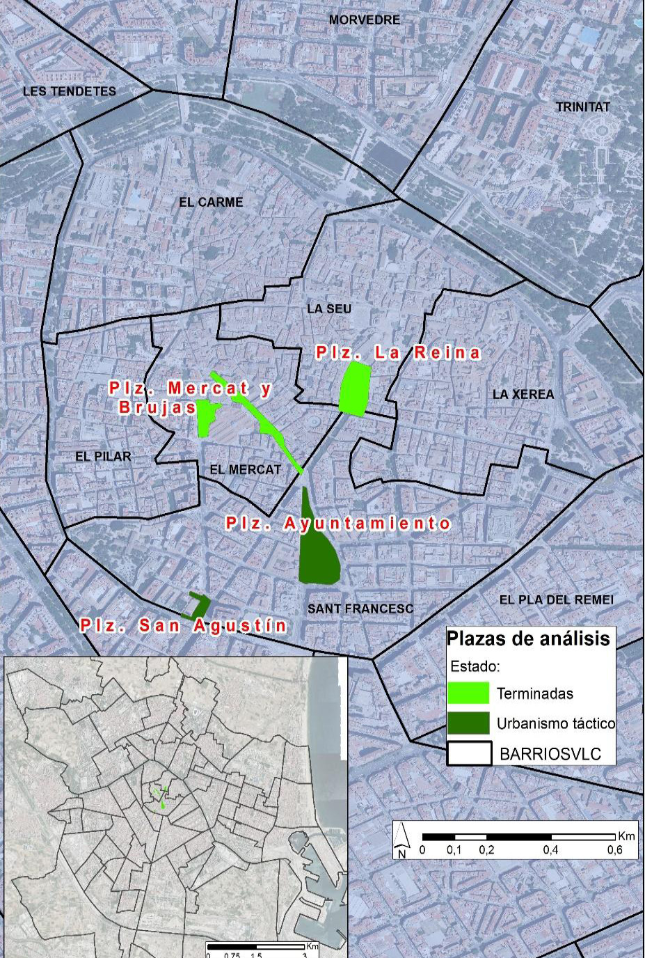 Entre las políticas realizadas, se ha escogido el proyecto “València de las plazas” porque es uno de los más difundidos dentro y fuera de la ciudad, cuenta con un mayor volumen de presupuesto y, además, se encuentra finalizado en gran parte, aunque a diferentes niveles (algunas plazas con final de obras y otras con urbanismo táctico y proyectos ya anunciados).