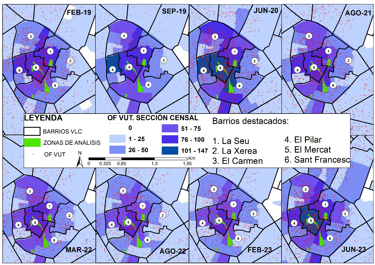 Figura 3. Evolución de las ofertas de viviendas turísticas por localización y sección censal en los barrios centrales de València. Fuente: elaboración propia a partir de InsideAirbnb.