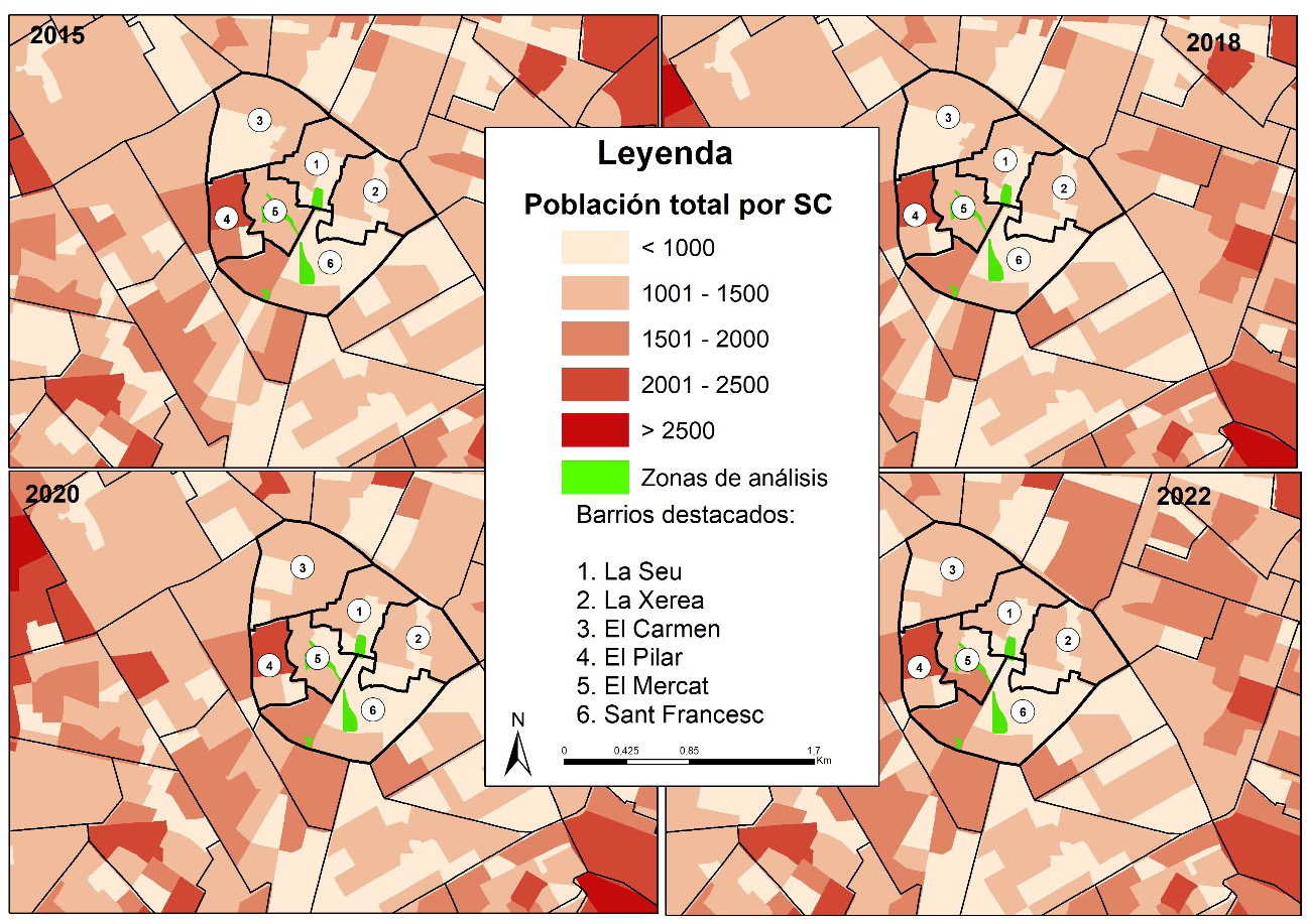 Con el tiempo, se observa un notable aumento en todos los barrios, excepto en El Carmen y El Pilar, donde el crecimiento es más moderado. El Carmen, una sección censal al norte, muestra un incremento, mientras que, al sur, en secciones censales sin contacto con las plazas, se registra una disminución. En El Pilar, el crecimiento es leve y se limita a las secciones censales adyacentes a la Plaza de Bruixes-Mercat.