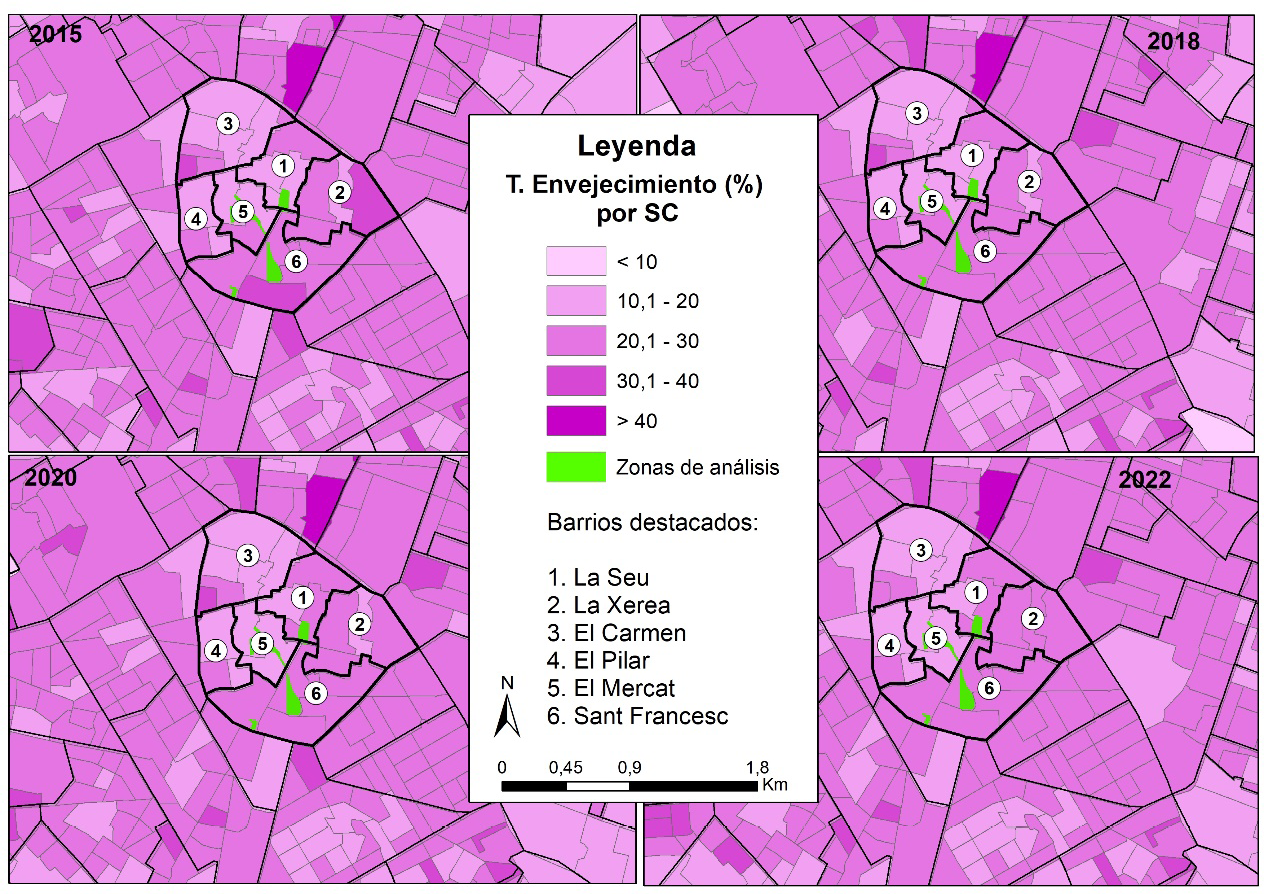 La evolución demográfica revela diferencias: en todos los barrios, las tasas de envejecimiento aumentan, mientras que en las secciones censales de las plazas y sus vecinas crecen por encima del 20%. Estos cambios se producen sobre todo a partir de 2018, cuando las plazas muestran mayor dinamismo, consolidándose entre 2018 y 2022. Durante este período, el barrio entero de El Mercat, más de la mitad de La Seu, así como las secciones censales ubicadas al norte del Ayuntamiento, superan todos el 20%.