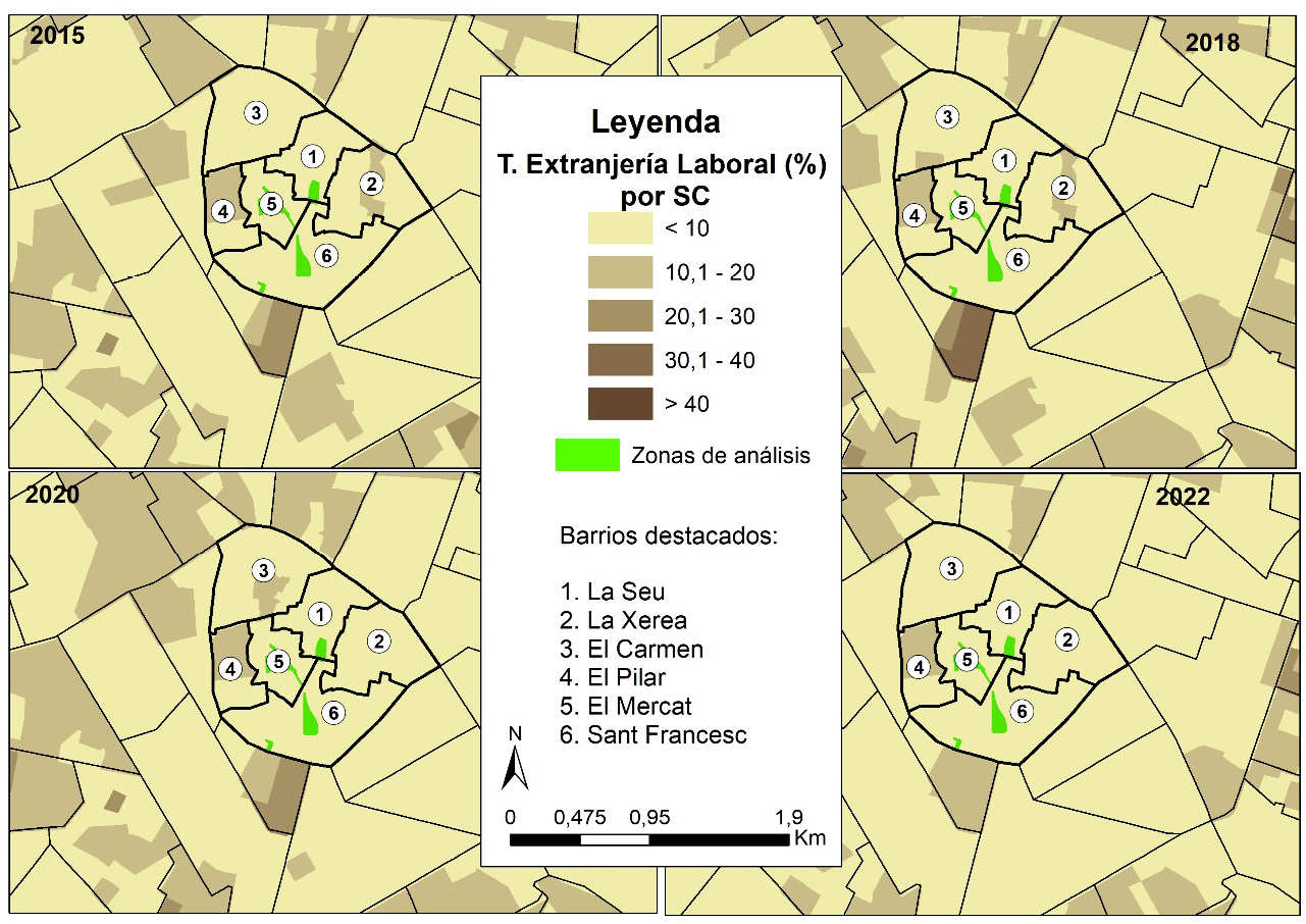 Finalmente, a partir de las tasas de extranjería laboral (Figura 11) se observa un estatismo en todas las secciones censales, solo disminuye una al sur de la Plaza de Sant Agustí barrio de La Roqueta del distrito de Extramurs. Es decir, pese a que la proporción de extranjeros tiene un considerable aumento este no es a partir de un crecimiento de los extranjeros de países típicamente laborales. Aunque se debe tener en cuenta la influencia en los resultados de las dobles nacionalidades, los datos hablan de un crecimiento de extranjeros, pero de la estabilidad de aquellos de países de renta baja, por lo que un crecimiento de la inmigración transnacional o expats sería plausible.