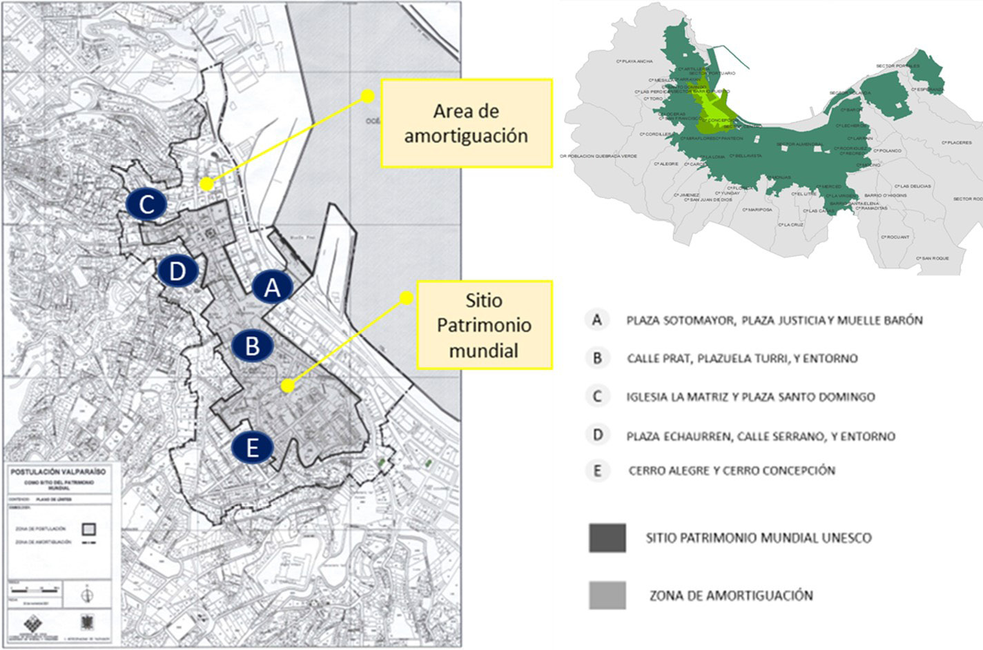 Figura 1. Valparaíso y los subsectores que componen el espacio declarado como Sitio Patrimonio de la Humanidad. Fuente: elaboración propia a partir de documento MINEDUC, 2004.