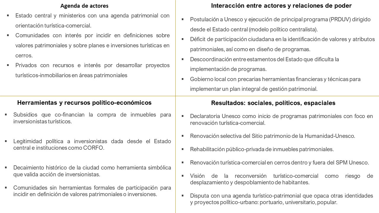 El caso de Valparaíso muestra cómo la declaratoria UNESCO adopta objetivos y contenidos específicos mediante un proceso de turistificación dirigido desde el Estado central, que, a través de planes, programas y la concentración espacial de la inversión, reconvierte áreas patrimoniales (principalmente los cerros Concepción y Alegre) en zonas de ocio y turismo. Actualmente se observa como esta actividad turística-inmobiliaria se extiende hoy a cerros fuera del sitio UNESCO, como Bellavista, Yungay y Playa Ancha bajo. Un ciclo de políticas urbanas post-UNESCO que evidencia los realineamientos que Mayer (1994) identificaba como propios de marcos de gobernanza proempresarial: 1) las autoridades públicas se enfocan proactivamente en proyectos de crecimiento económico empresarial; 2) las políticas urbanas enfocadas a la provisión de servicios sociales básicos se subordinan a las políticas centradas en el crecimiento económico; y 3) las coaliciones público-privadas, en forma de programas, orientación de subsidios o planes, predominan.