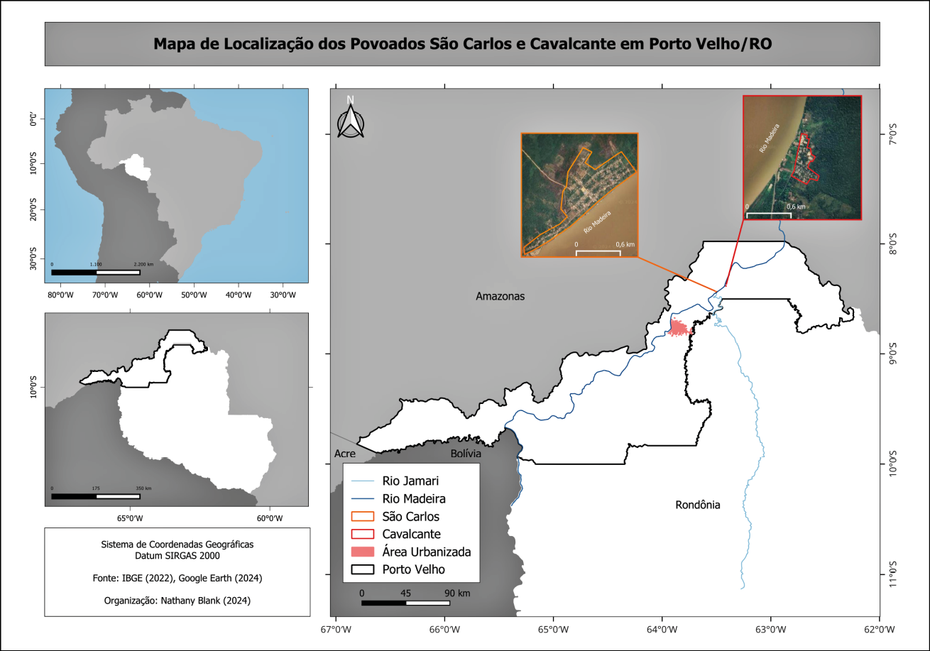 O município de Porto Velho, na margem direita do rio Madeira, apresenta área de 34.096 km2, com aproximadamente 460 mil habitantes (IBGE, 2023). O projeto é desenvolvido nas comunidades de São Carlos e Cavalcante (Figura 2), sendo intenção ampliar as ações a outras localidades, com base na experiência adquirida nas duas iniciais comunidades ribeirinhas que acolheram nossa presença e proposta interativa.