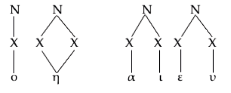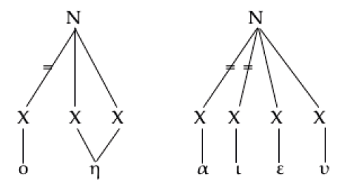 Esta clase de expresiones se encuentra en el dominio de la Condición de Exceso de Moras, que se formula en (7), la cual se aplica en griego de la manera más general, y es independiente de los fenómenos de coalescencia. La misma dice que una sílaba puede contener a lo más dos moras y que el rebasamiento de dicha medida engendra una estructura impropia.