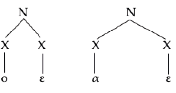 Este estudio se desarrolla en el plano del análisis de la contracción realizado en diversos estudios de fonología prosódica del griego ático.2 En la perspectiva teórica adoptada, la crasis y la contracción (fenómenos que entrañan encuentro de vocales) se amoldan a las prescripciones de la Condición Antihiática, que se formula de manera sucinta en (1), donde los símbolos de constituyentes se interpretan con los valores convencionales en fonología métrica: σ representa la sílaba; R, la rima o extremo final de la sílaba; N, el núcleo de la sílaba; X, la ranura de unidades del esqueleto prosódico de que depende la especificación cuantitativa. V1 y V2 representan vocales entendidas como agrupaciones de atributos ordenados jerárquicamente, según lo que dispone la geometría de rasgos fonológicos.3 El asterisco denota la inadecuación de la secuencia.