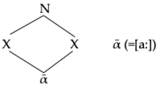 La Condición Antihiática excluye las secuencias de vocales adyacentes que saturan núcleos de sílabas distintas. A causa de (1), las vocales en hiato, tanto en la crasis como en la contracción, vienen a coligarse en un núcleo común, en un proceso que tiende a preservar en lo posible la cantidad del input, y en el que se entremezclan los rasgos melódicos de los segmentos. Este proceso de coalescencia se esquematiza en (2), donde la flecha (→) se usa como símbolo de conversión, y la doble raya (₌) es el símbolo de desconexión. Ā es la vocal larga producto de la coalescencia, la cual puede ser cualitativamente distinta de las vocales del input. Cada X del esqueleto prosódico en (2) vale por un tiempo o mora.