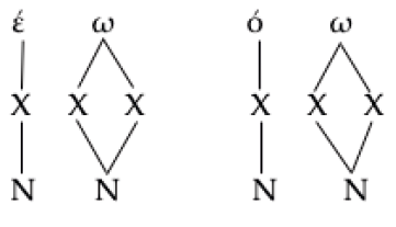 En estos casos, los dos núcleos de sílaba que se amalgaman en el producto son portadores de acento en la fase inicial. La coalescencia se acomoda, por cierto, a la condición de estar regida por un único acento, pero este no procede de la última, sino de la primera voz de la secuencia del input, la interjección ὦ, de cuyo carácter monosilábico no cabe deducir ningún tipo de atonía. Por el contrario, su valor conativo entraña más bien alguna forma de énfasis (cfr. Jakobson; Waugh, 1987:47). Atrás se comprobó que dicha interjección invoca una regla especial de propagación que preserva sus rasgos melódicos. Ahora se comprueba que la misma es correlato de otra regla que mantiene su estructura prosódica. Pero la crasis de (32a), al igual que las de (31), infringe las normas de la acentuación léxica: el producto exhibe signo de circunflejo en la antepenúltima sílaba, en abierta discrepancia con las reglas que limitan la distribución del tono en el lexicón (Probert, 2006:60).