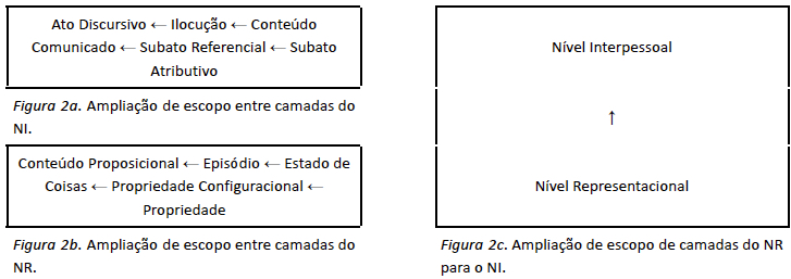 Segundo Hengeveld (2017), a modularização do componente gramatical organizado em níveis e camadas, torna possível tratar da gramaticalização de formas linguísticas como um processo de mudança que leva à ampliação de seu escopo de atuação, dos níveis e camadas mais baixos para os níveis e camadas mais altos do componente gramatical. Isso significa, segundo o autor, que a mudança das formas linguísticas, no plano do conteúdo, tende a ser gradual obedecendo ao aumento sistemático de escopo das camadas e níveis e, no plano da forma, é também gradual e envolve uma diminuição sistemática da lexicalidade. No caso da mudança de conteúdo, é importante destacar que funções pragmáticas do NI podem se desenvolver diacronicamente a partir de funções semânticas do NR, mas o contrário não se verifica, como atestam Hengeveld e Wanders (2007). Segundo Hengeveld (2017), o aumento de escopo das expressões linguísticas, envolvendo o NR e o NI, ocorre unidirecionalmente, no plano horizontal entre as camadas do mesmo nível (NI ou NR) (cf. figuras (2a) e (2b)) ou no plano vertical entre camadas do nível inferior (NR) e as do superior (NI) (cf. figura (2c)).