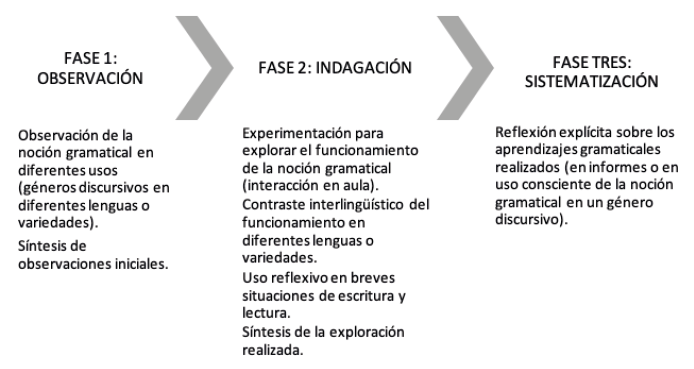 Por tanto, entendemos que la institución educativa ha de asumir dos responsabilidades específicas en relación con la gramática escolar: que los alumnos construyan los conceptos gramaticales básicos sobre las lenguas que utilizan y que aprendan a reflexionar sobre las distintas lenguas del currículo escolar, de forma que puedan contrastarlas para conocerlas en profundidad y usar ese conocimiento también en el aprendizaje de otras lenguas no presentes en el currículo (Rodríguez-Gonzalo 2022). Para ello, una gramática escolar ha de ocuparse de la relación entre los contenidos de enseñanza y la forma de intervenir en el aula para hacer posible su aprendizaje. Es decir, ha de explicitar la relación entre el qué (objeto de enseñanza) y el cómo (metodología).